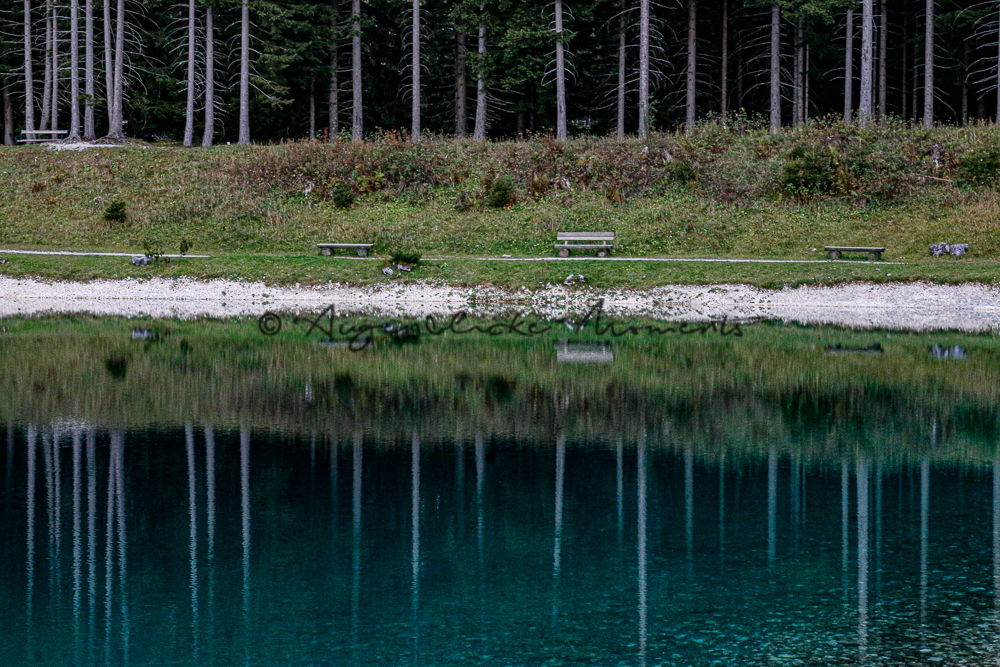 Wasserspiegelung Erwalder Almsee – da waren wir von der Klarheit des Bergsees direkt an der Ehrwalder Alm (Österreich) unterhalb von der Zugspitze begeistert. Es spiegelt sich im Wasser das Wettersteingebirge.